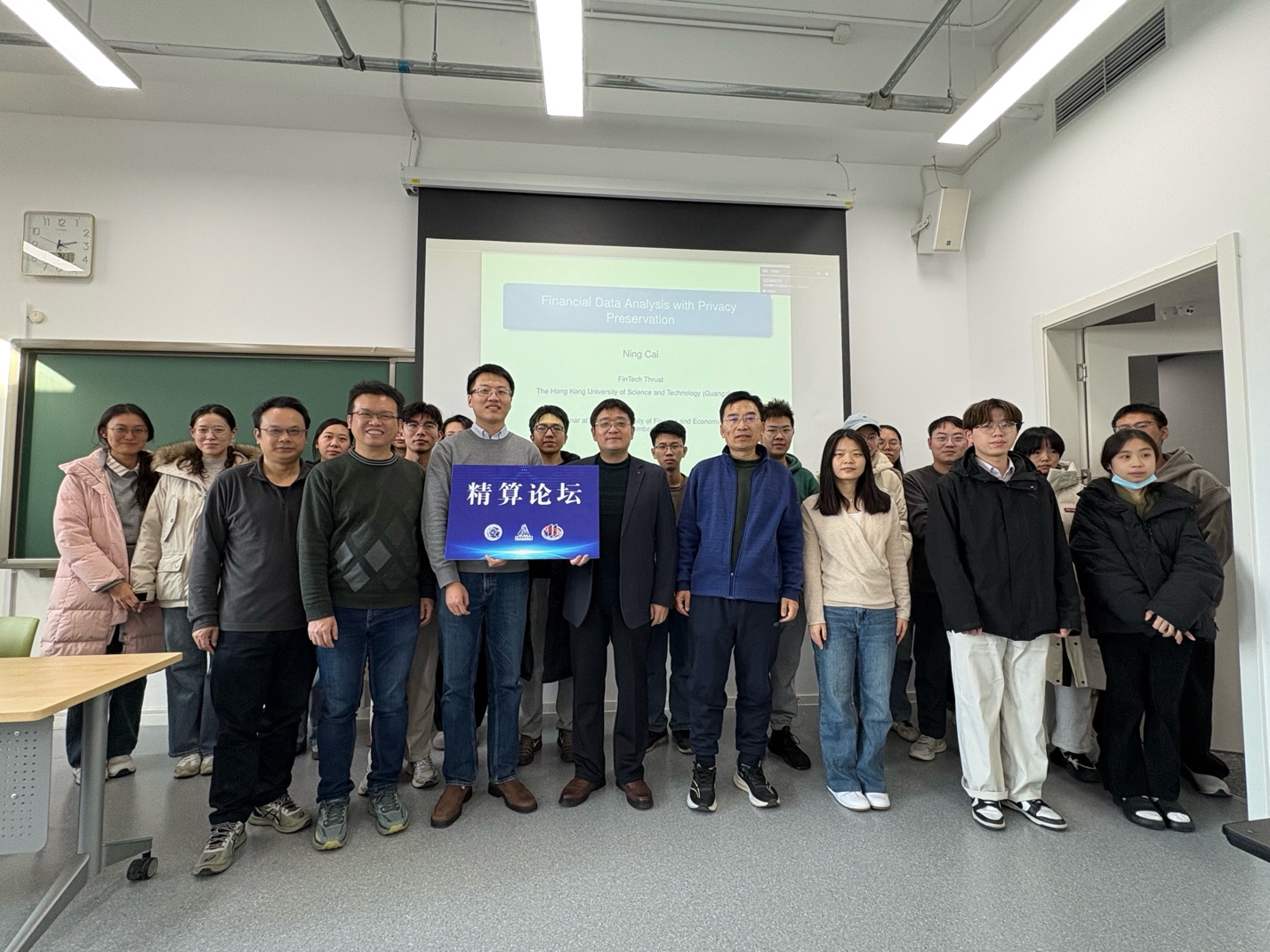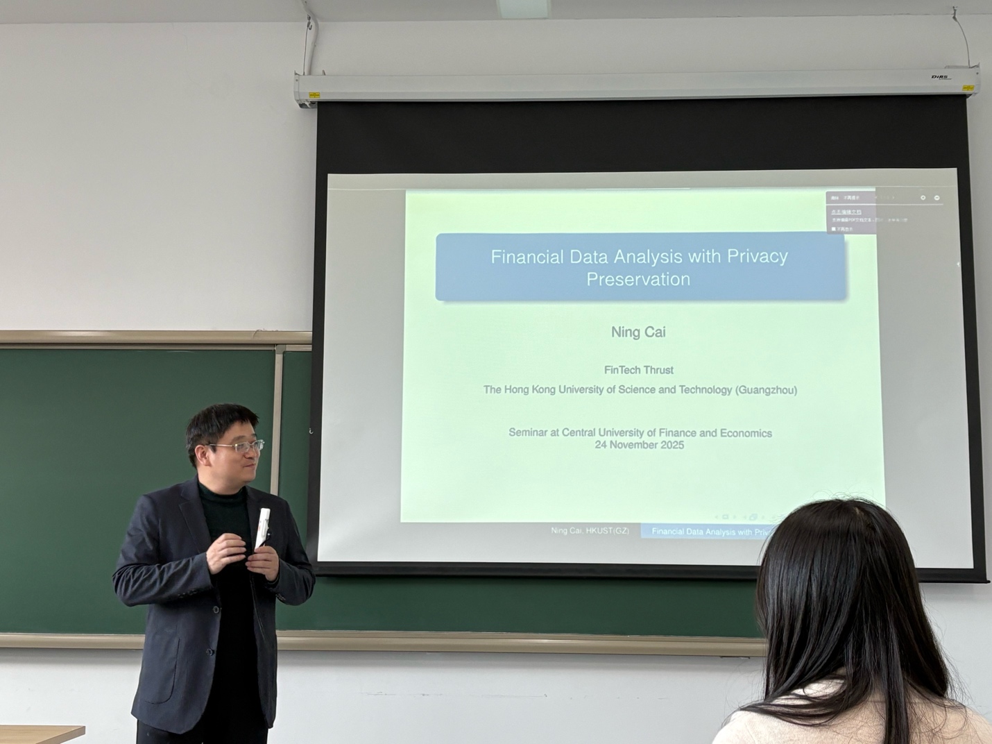 首先,蔡宁教授以“隐私保护下的金融数据分析”为题,为在场师生带来了金融科技前沿研究成果的分享。蔡教授指出,在大数据时代,数据隐私已成为公众核心关切,尤其在涉及敏感信息的金融科技领域。他系统介绍了其团队为解决数据收集、统计推断及重抽样等关键环节中的隐私问题所开发的一系列创新算法,并从理论层面证明了这些算法在严格定义的隐私框架下的安全性。蔡教授进一步展示了这些隐私保护算法的具体应用,为金融数据在安全合规的前提下创造更大价值提供了新的技术路径。