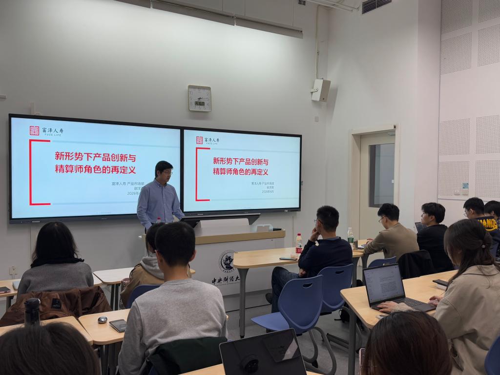 2026 年 4 月16日晚,教育部人文社科重点研究基地中央财经大学中国精算研究院第 282 期精算论坛在沙河校区二教 110 教室顺利举行。本次论坛特邀富泽人寿保险股份有限公司产品市场部副总经理、中国精算师与北美精算师双证持有人谢洋霖先生,带来了题为“新形势下保险产品开发和精算师扮演的角色”的专题分享。论坛由保险学院、中国精算研究院廖朴教授主持,保险与精算专业的博士研究生、硕士研究生到场聆听学习。