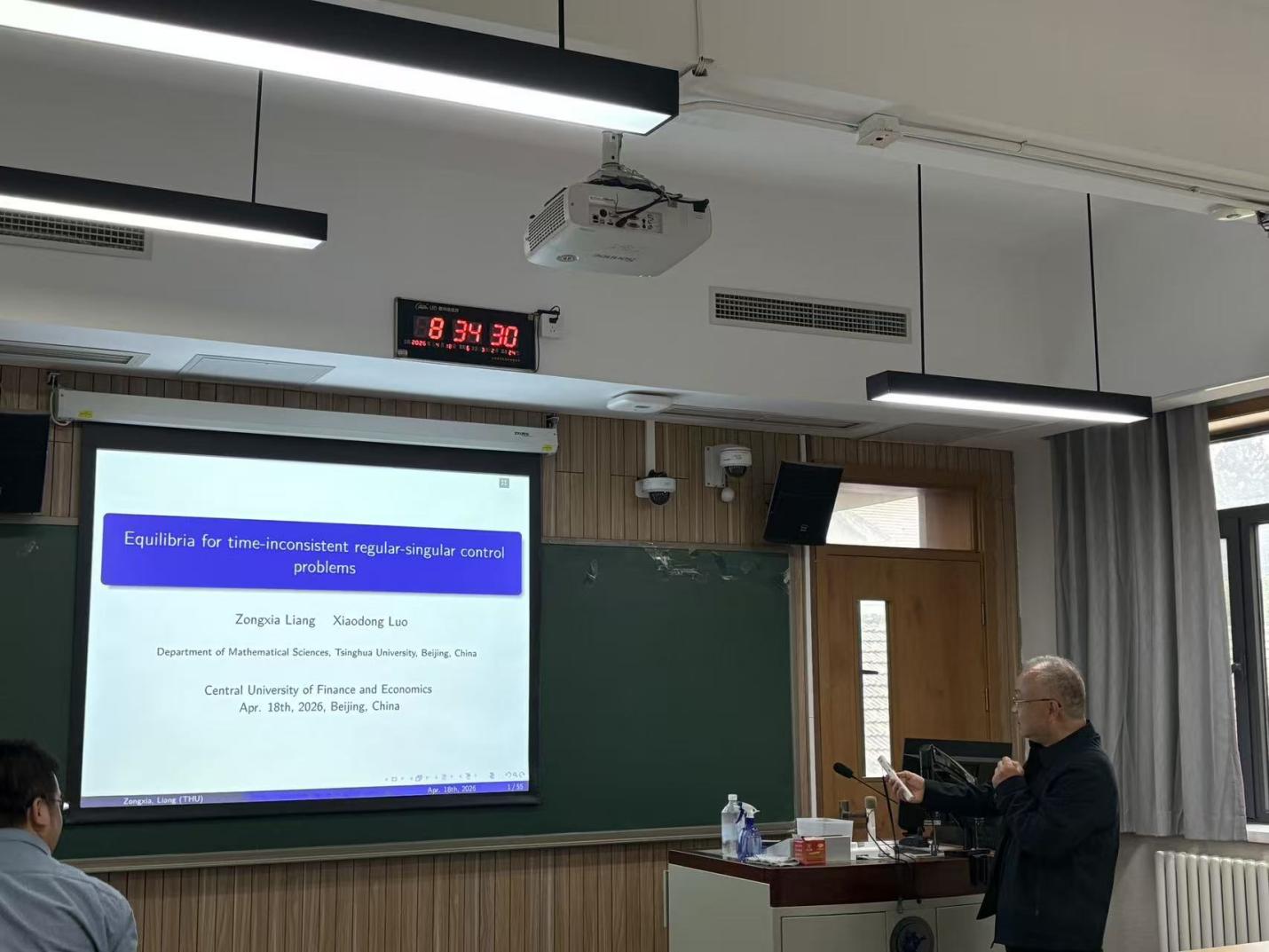 梁宗霞教授以“Equilibria for Time-inconsistent Regular-singular Control Problems”为题作报告。首先,他介绍了时间一致和时间不一致问题的由来及研究进展,特别是时间不一致正则控制问题中的均衡概念。随后,他提出奇异控制问题的均衡框架,并对非指数贴现下的时间不一致奇异控制问题进行了分析与求解。在此基础上,梁老师进一步构建了时间不一致正则—奇异控制问题的均衡理论框架,并结合此新兴方向的研究进展,梳理了若干值得深入研究的关键公开问题。该报告展示了随机控制与优化理论的最新成果,也为相关研究提供了清晰的理论脉络。