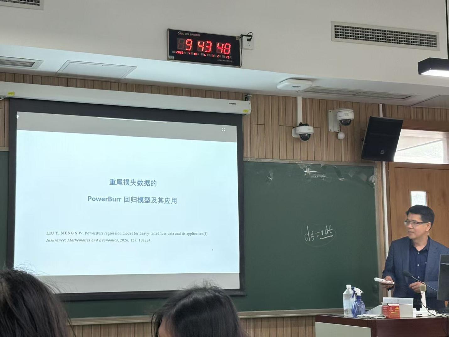 孟生旺教授作了题为“巨灾风险的精算统计模型与应用”的报告。孟老师围绕巨灾损失数据建模这一风险管理中的基础问题,系统介绍了PowerBurr分布及其分布族的统计性质、尾部特征及其在回归建模中的应用,并给出了参数估计与模型检验的方法。他指出,常用的Lomax回归模型可视为该模型体系的一个特例。最后,孟教授将相关模型应用于中国地震损失数据,并与其他厚尾分布回归模型进行了比较,结果表明新模型在预测精度上具有明显优势。报告兼具理论深度与现实意义,为巨灾风险管理提供了新的建模工具。